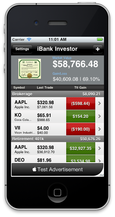 Now that I’ve shown you the main screens of iBank Investor, let’s talk about a few other things. We are initially releasing this as a free, ad-supported app. We might introduce a paid version later that removes the ad banner, but no promises there yet. Syncing happens in the background with minimal invasion and only when it should – you don’t have to push a “sync” button to to update! Similarly, quotes are updated and downloaded each time you bring the app to the front. This is done on a background thread so that UI remains responsive.