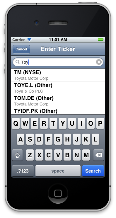 To add a position, you press the + button in the upper right. (Note that if you are syncing your portfolio from iBank for Mac, the data is read only.) This brings up a modal view where you are asked to enter a security. One nice thing we’ve added for this is symbol suggestions. For example, let’s say you don’t know the symbol for Toyota; if you start typing “Toy,” you’ll get suggestions: