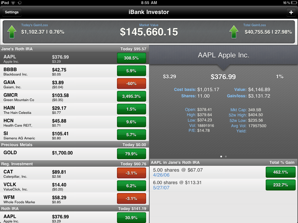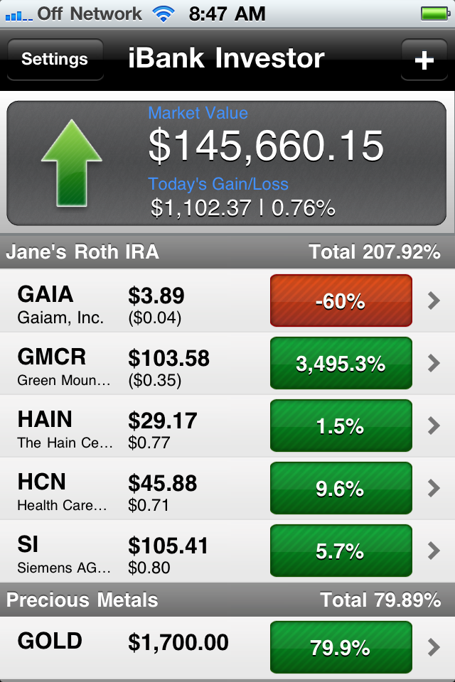 iBank Investor on iPhone -- Tapping the green/red button toggles what calculation is shown in that column