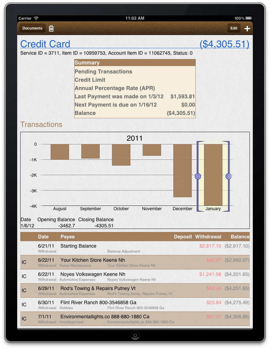 Although it isn’t evident in this screenshot, the selection on the bar chart drives the transaction list below. So if you wanted to see transactions from September to November you would select that range in the chart. To edit a transaction, you simply tap it, and to get back to the Document Home View, you just swipe the page to the right to make it go away. (You can ignore the debugging info at the top of the page — as I said, these screens aren’t polished.)