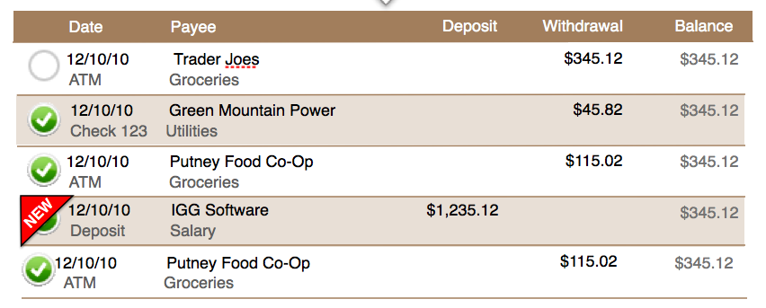 After you enter valid credentials to log in to the bank’s website, you are given a list of accounts that you have at that financial institution – with the option of choosing which accounts you actually want in iBank. For example, many folks might have a checking, savings and even credit card all at the same bank and in the last screen you would be given the option to choose which of these you might not want to import. Most users will link all of the accounts. When the accounts are created, iBank imports available historical transactions associated with each account and even does some automatic categorization. Here is where the beauty of our new aggregation system really begins to shine. Each time you launch the app, it goes out and fetches any new transactions. Unlike iBank for Mac, however, there is no separate window that appears where you have to manually verify which transactions to import. The new transactions just automatically appear conveniently marked: