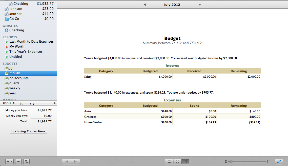 A third button in the centered bottom control is where you click to see this view. When you click this button you get a full report on your budget (the exact look and feel subject to change and in fact, it probably will change) which can be multiple pages long and gives you WYSIWYG printing. Additionally, you can click on any category and drill down to see the transactions that make up the amount you spent for each category. This is a big feature for me, when I look at my budget I frequently want to see the specific transactions that are contributing to the “spent” column.