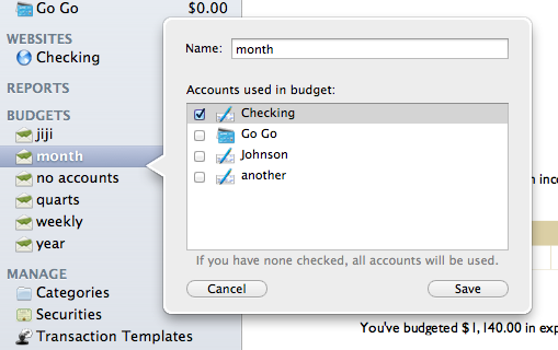 New Budget Inspector. The other big feature to budgets we’ve added is the ability to change which accounts are used via a new budget popup inspector. Prior to iBank for Mac 4.6, you could choose which accounts to use in your budget when you set it up, but you couldn’t change them ever again. This was a drag, and I apologize to those who deleted their budget just to set it up again so they could exclude or include a new account. Now, all you have to do is double-click the budget in the source list and you can pick and choose, anytime, which accounts will be used when calculating your budget.