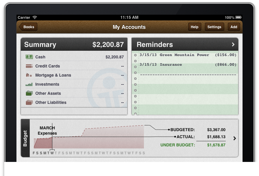 The process of budgeting for bills and “unscheduled expenses,” like groceries and gas, works quite well in iBank for iPad. I not only get an overview of what my expenses should be for the month, but I can also see exactly within the month when I need cash for bills. The following screenshot illustrates the predictive power of of the budgeting in iBank for iPad — at the start of each month I know almost exactly how much I’m going to spend and how that is distributed over the month.