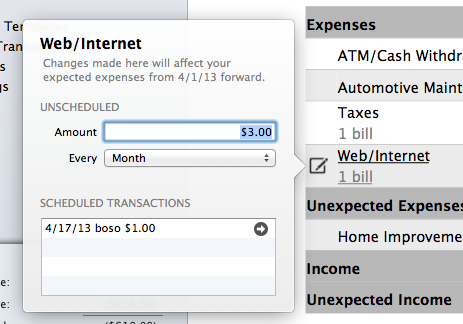 The Budget Item popover lets you quickly change a budgeted amount (and we track your changes) or jump to a specific scheduled transaction, where it can be edited as well.