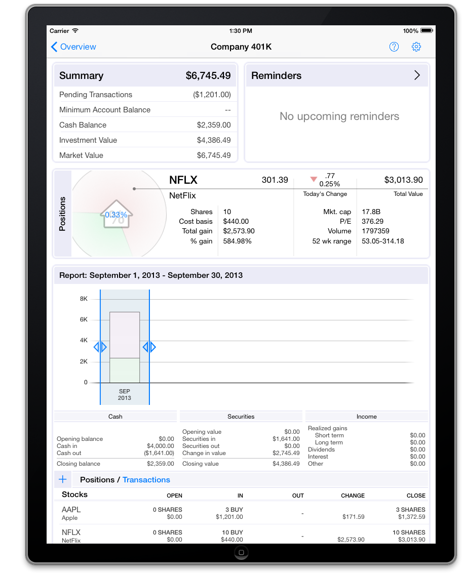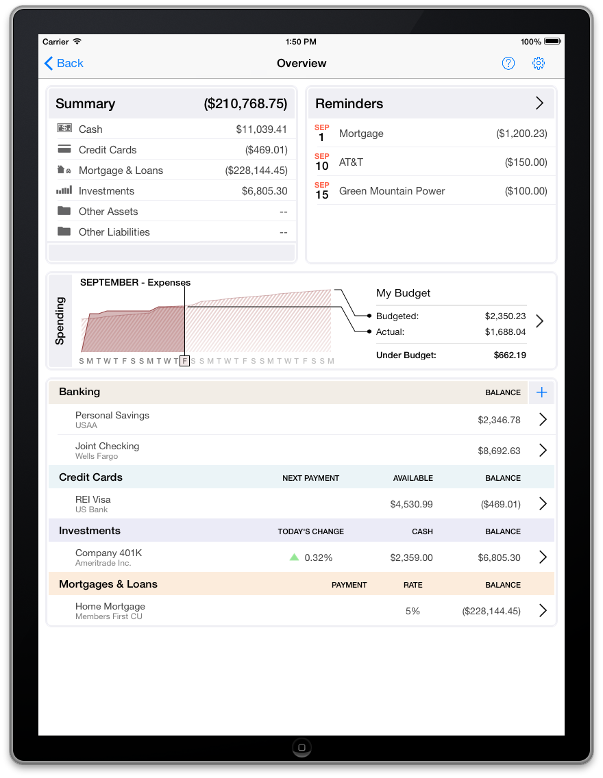 Practically every screen has been revisited for iBank for iPad 2.0. For example, here is the new investment account screen: