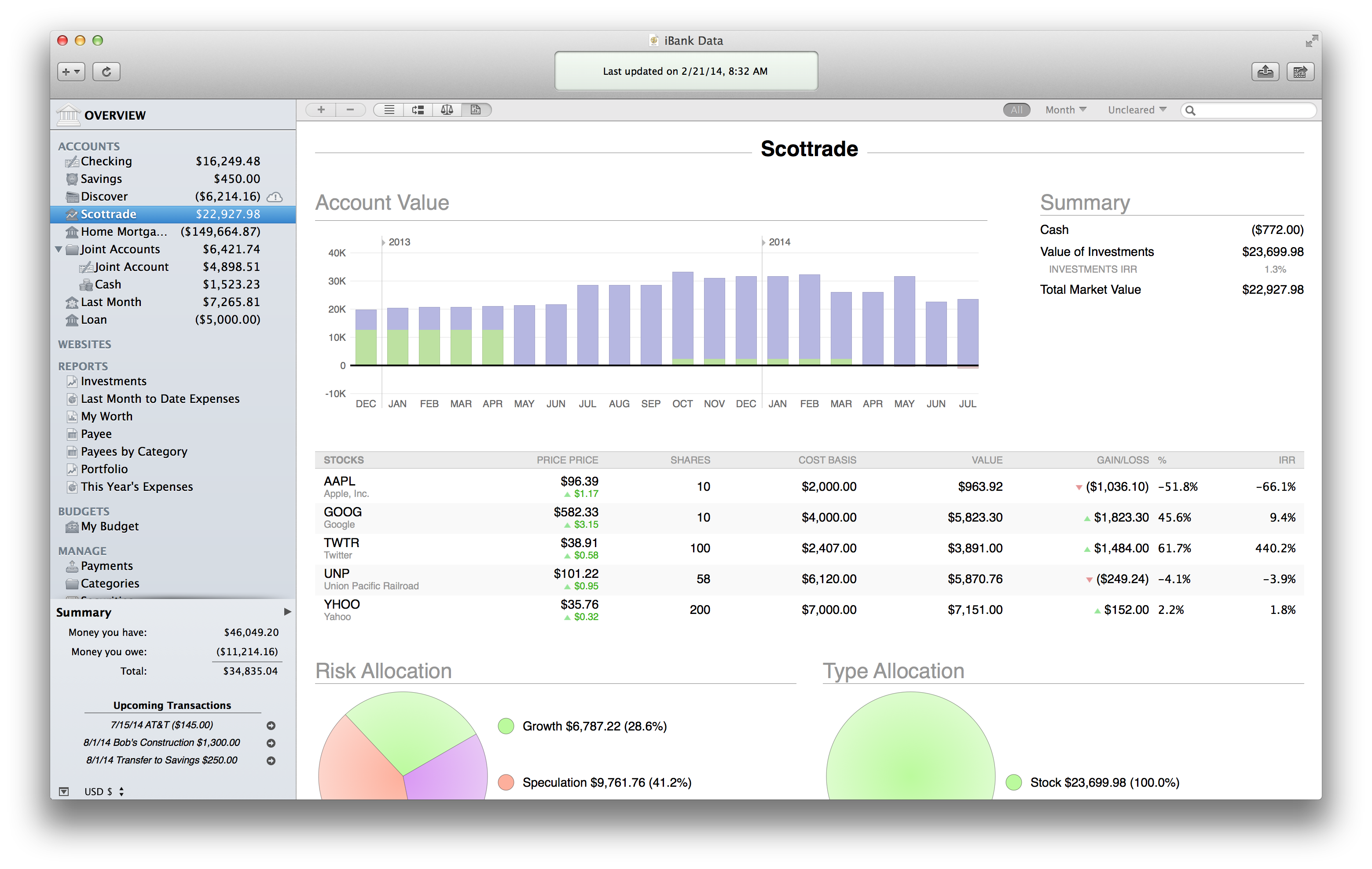 For investment accounts, you can now take a glance at your holdings without making any reports, including data on IRR, cost basis, and gains and losses.