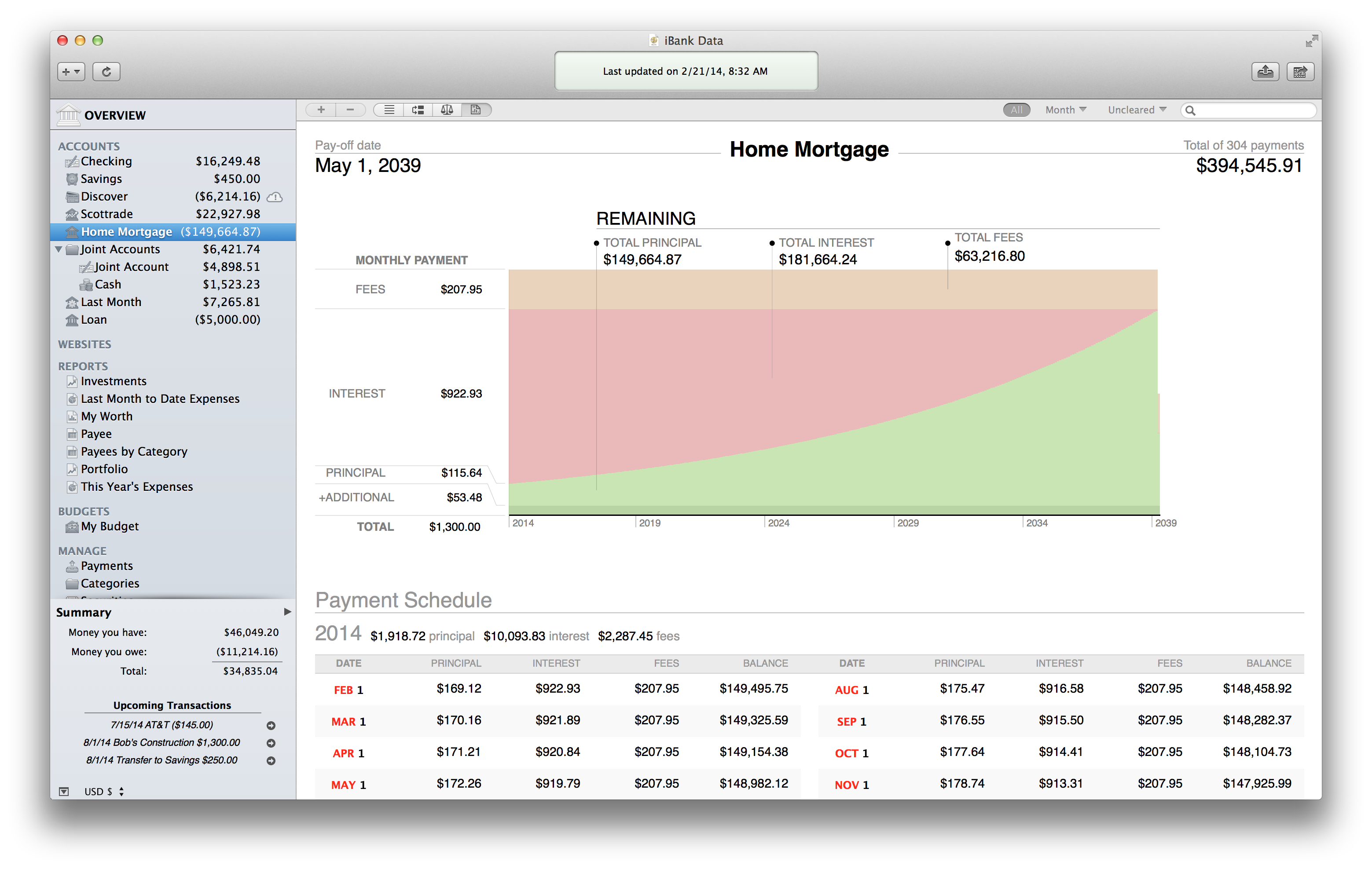 Selecting the new “report” segmented button will get you a summary for the selected account. And in each summary, iBank customizes the data depending on what type of account you are viewing. For example, a loan account will show you a nice breakdown of the data specific to your loan. We also show a full amortization table so users no longer have to generate a report to do this.