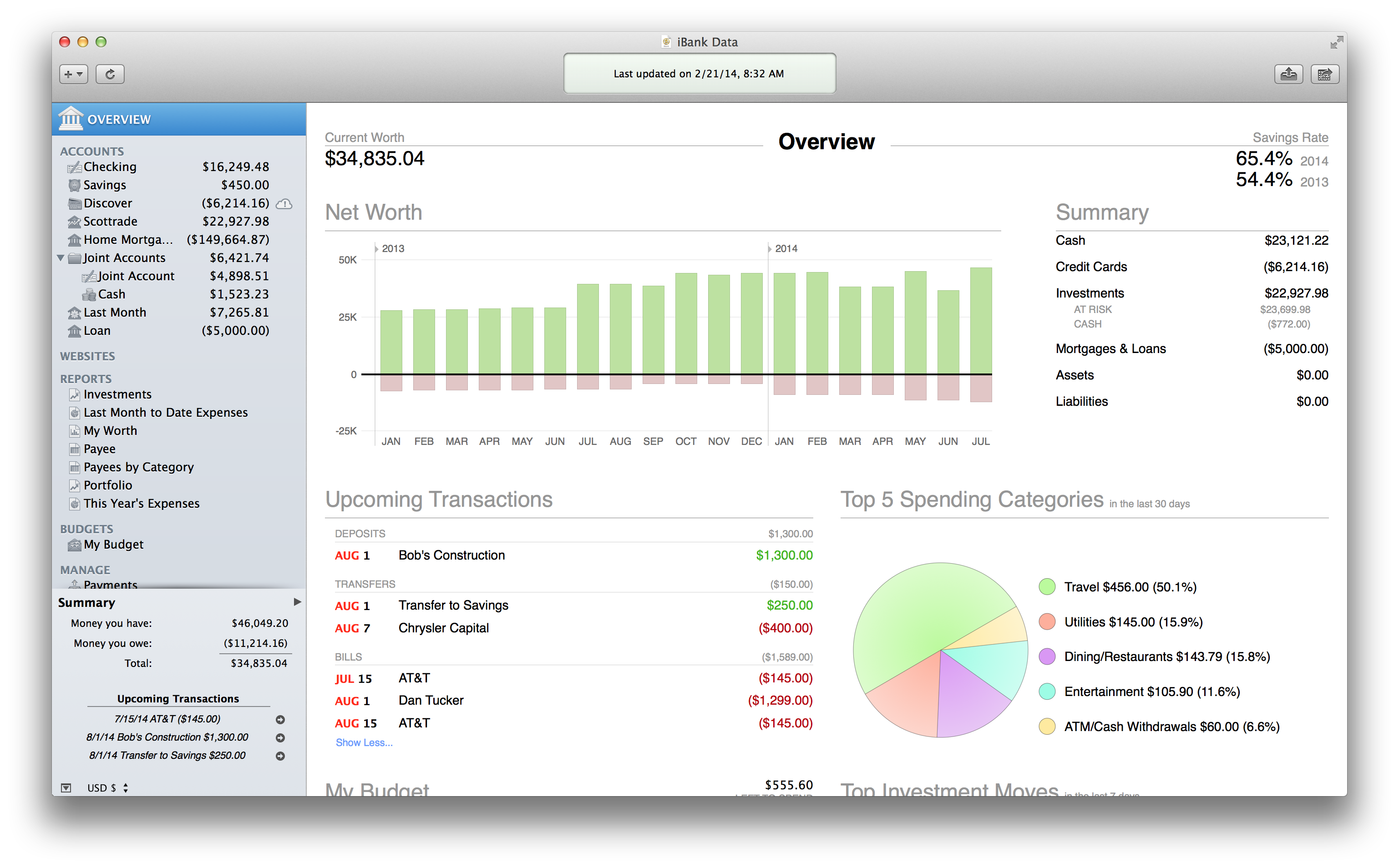 As you can see, this screen breaks out the most critical parts of your financial information, including a new parameter not previously available in iBank: your savings rate. We also show net worth though time, account balances summary, upcoming transactions, spending, budgets and investments. This screen is easy to read and very printer-friendly. When you do print it, we page break where you expect and even bring over column headers on new pages.
