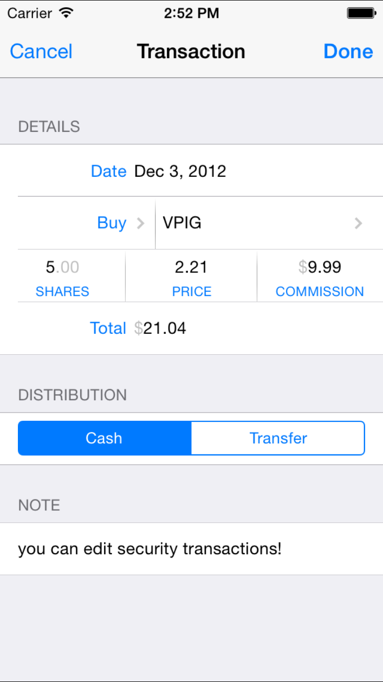 One thing that always prevented iBank Mobile from feeling really complete was the lack of security transaction support. I’m pleased to announce that in iBank for iPhone you will now be able to add, edit or delete security transactions. The app also pulls stock quotes to provide near real-time investment price valuations.