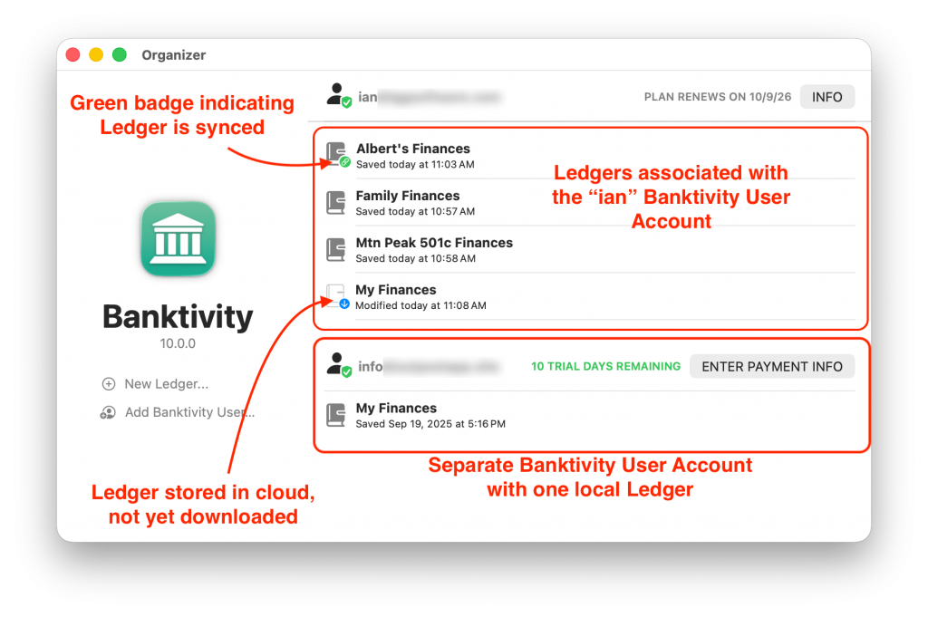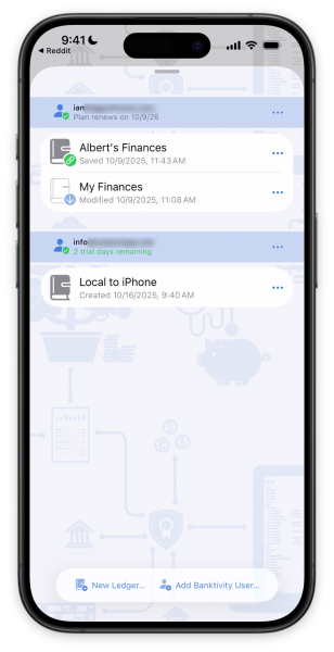 You’ll notice that it’s easy to tell the state of each ledger. For example, in both screenshots, “Albert’s Finances” is synced and downloaded locally to the device. Whereas “My Finances” isn’t downloaded locally on either device. In the Mac screenshot you’ll also see that there are two ledgers that are entirely local to the device and aren’t syncing at all. Similarly, in both screenshots, you can see there are two different Banktivity User Accounts, each with totally separate and isolated ledgers.